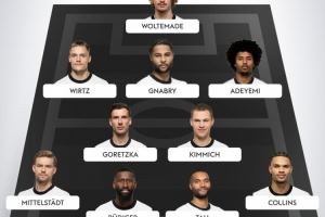 后卫:米特尔施塔特(斯图加特)、吕迪格(皇马)、若纳坦-塔(拜仁)、纳姆迪-科林斯(法兰克福)
